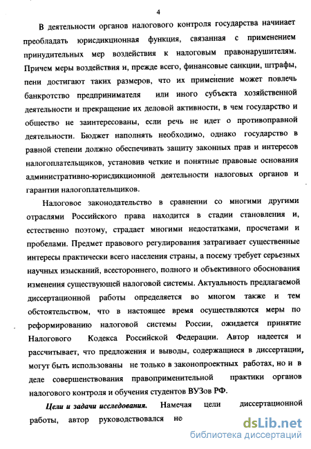 Налоговое законодательство в сравнении со многими другими отраслями Российского права находится в стадии становления и, естественно поэтому, страдает многими недостатками, просчетами и пробелами. Предмет правового регулирования затрагивает существенные интересы практически всего населения страны, а посему требует серьезных научных изысканий, всестороннего, полного и объективного обоснования изменения существующей налоговой системы. Актуальность предлагаемой диссертационной работы определяется во многом также и тем обстоятельством, что в настоящее время осуществляются меры по реформированию налоговой системы России, ожидается принятие Налогового Кодекса Российской Федерации. Автор надеется и рассчитывает, что предложения и выводы, содержащиеся в диссертации, могут быть использованы не только в законопроектных работах, но и в деле совершенствования правоприменительной практики органов налогового контроля и обучения студентов ВУЗов РФ.