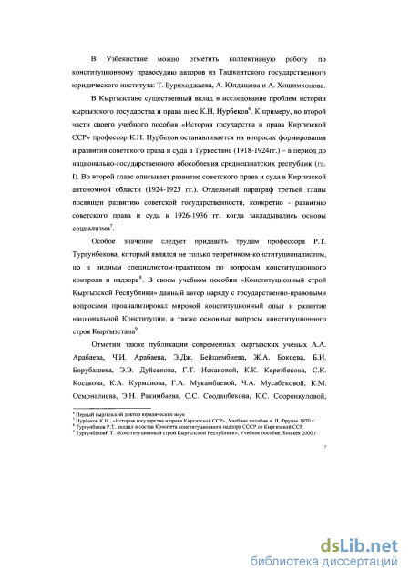В Кыргызстане существенный вклад в исследование проблем истории кыргызского государства и права внес К.Н. Нурбеков6. К примеру, во второй части своего учебного пособия «История государства и права Киргизской ССР» профессор К.Н. Нурбеков останавливается на вопросах формирования и развития советского права и суда в Туркестане (1918-1924гг.) - в период до национально-государственного обособления среднеазиатских республик (гл. I). Во второй главе описывает развитие советского права и суда в Киргизской автономной области (1924-1925 гг.). Отдельный параграф третьей главы посвящен развитию советской государственности, конкретно - развитию советского права и суда в 1926-1936 гг. когда закладывались основы социализма7.
