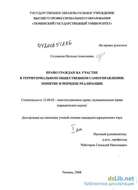 Предмет исследования - теоретические и правовые источники, регулирующие реализацию права граждан на участие в территориальном общественном самоуправлении; сущность и понятие права граждан на участие в ТОС; место ТОС в системе местного самоуправления; порядок создания ТОС, организационно-правовая форма ТОС и правовой статус решений органов ТОС; территориальная организация ТОС; финансово-экономическая основа ТОС; основные направления деятельности и компетенция ТОС.