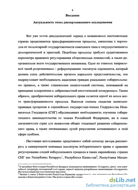 Актуальность темы диссертационного исследования. Вот уже почти двадцатилетний период в независимых постсоветских странах продолжаются трансформационные процессы, связанные с переходом от тоталитарной государственности советского типа к государственности демократической и правовой. Подобные процессы требуют существенного пересмотра правового регулирования общественных отношений, а также реорганизации всего государственного механизма. Одно из главных направлений такой реорганизации – реформирование института парламента, который должен стать действительным органом народного представительства, что подразумевает необходимость наделения граждан реальными избирательными правами, а также становление политической системы, основанной на принципах плюрализма и добросовестной политической конкуренции. Таким образом, преобразование избирательного права является одной из основ всего трансформационного процесса. Высокая степень сходства политико-правовых процессов в европейских государствах-членах Содружества Независимых Государств (СНГ) обусловливает необходимость изучения избирательного законодательства не только Российской Федерации, но и иных постсоветских стран для выявления общих тенденций развития избирательного права, а также оптимальных путей разрешения возникающих в этой сфере проблем.