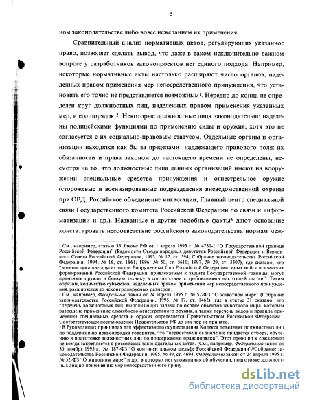 Сравнительный анализ нормативных актов, регулирующих указанное право, позволяет сделать вывод, что даже в таком исключительно важном вопросе у разработчиков законопроектов нет единого подхода. Например, некоторые нормативные акты настолько расширяют число органов, наделенных правом применения мер непосредственного принуждения, что установить его точно не представляется возможным1. Нередко до конца не определен круг должностных лиц, наделенных правом применения указанных мер, и его порядок 2. Некоторые должностные лица законодательно наделены полицейскими функциями по применению силы и оружия, хотя это не согласуется с их социально-правовым статусом. Отдельные органы и организации находятся как бы за пределами надлежащего правового поля: их обязанности и права законом до настоящего времени не определены, несмотря на то, что должностные лица данных организаций имеют на вооружении специальные средства принуждения и огнестрельное оружие (сторожевые и военизированные подразделения вневедомственной охраны при ОВД, Российское объединение инкассации, Главный центр специальной связи Государственного комитета Российской Федерации по связи и информатизации и др.). Названные и другие подобные факты3 дают основание констатировать несоответствие российского законодательства нормам меж-