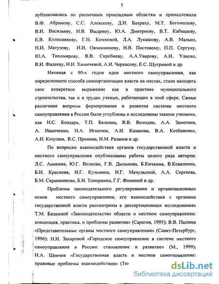 Начиная с 90-х годов идеи местного самоуправления, как определенного способа самоорганизации власти на местах, стали находить свое конкретное выражение как в практике муниципального строительства, так и в трудах ученых, работающих в этой сфере. Самые различные вопросы формирования и развития системы местного самоуправления в России были углублены и исследованы такими учеными, как Н.С. Бондарь, Т.П. Бялкина, В.В. Володин, А. А. Замотаев, А. Иванченко, Н.А. Игнатюк, А.И. Казакова, В.А. Козбаненко, А.И. Козулин, B.C. Пронина, Н.М. Рязанов и др.