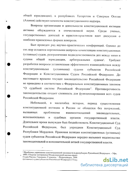 Объектом настоящего исследования служит правовое регулирование деятельности конституционных (уставных) судов, практика их функционирования; взаимоотношение органов конституционной юстиции с судами общей юрисдикции и арбитражными судами, роль конституционных (уставных) судов в реализации принципа разделения властей и построении демократического правового государства. Работа выполнена на основе анализа законодательства Российской Федерации, субъектов Российской Федерации, в которых действуют органы конституционного контроля (республик Адыгеи, Башкортостана, Бурятии, Дагестана, Калмыкия-Хальмг Тангч, Карелии, Коми, Марий-Эл, Саха (Якутия), Северной Осетии, Татарстана, Кабардино-Балкарской, областей Иркутской и