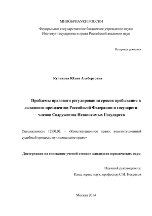 При подготовке данного исследования были также использованы диссертационные работы, в которых рассматриваются отдельные проблемы, связанные со сроками полномочий президентов стран СНГ и основаниями досрочного их прекращения. Это работы таких авторов, как А.Ш. Арутюнян, Н.В. Бобракова, СВ. Березка, Э.М. Васекина, А.В. Зуйков, В.А. Зорин, А.А. Карташов, С.Г. Колбая, К.М. Конджакулян, А.А. Огородников, Г.С. Родионова, А.Е. Рябов, Т.Л. Тенилова, Б.Ч. Чжан и др.