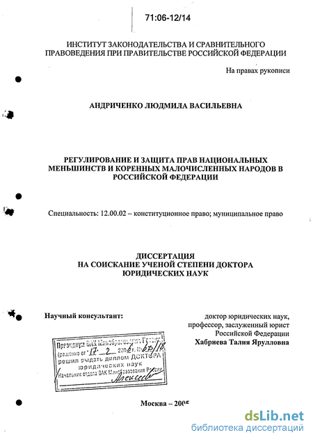Теоретическая и практическая значимость, апробация результатов исследования. Сделанные в работе выводы могут быть использованы в целях совершенствования действующего законодательства, направленного на сохранение самобытности в сфере развития национальной культуры, использования родного языка, защиты исконной среды обитания и традиционного образа жизни. Практические рекомендации апробировались посредством внесения предложений по совершенствованию действующего законодательства, прежде всего Федеральных законов «О национально культурной автономии», «О гарантиях прав коренных малочисленных народов Российской Федерации», «О территориях традиционного природопользования коренных малочисленных народов Севера, Сибири и Дальнего Востока Российской Федерации», «Об общих принципах организации общин коренных малочисленных народов Севера, Сибири и Дальнего Востока Российской Федерации», «Об общих принципах организации законодательных (представительных) и исполнительных органов государственной власти субъектов Российской Федерации» и других, а также при подготовке новой редакции Концепции государственной национальной политики Российской Федерации, ряда постановлений Правительства Российской Федерации.