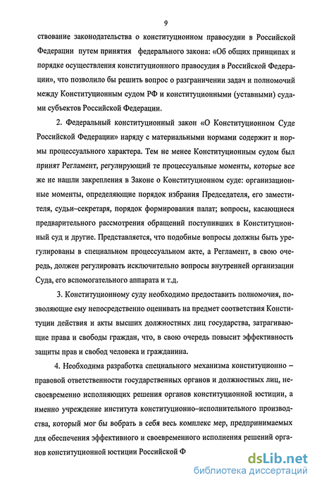 9 ствование законодательства о конституционном правосудии в Российской Федерации путем принятия федерального закона: «Об общих принципах и порядке осуществления конституционного правосудия в Российской Федерации», что позволило бы решить вопрос о разграничении задач и полномочий между Конституционным судом РФ и конституционными (уставными) судами субъектов Российской Федерации.