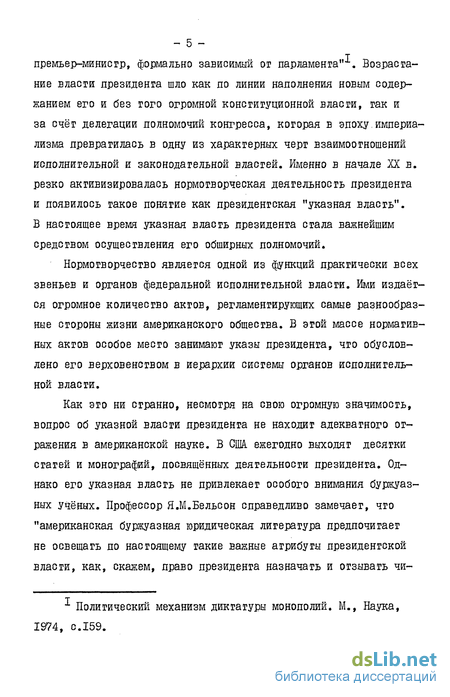 В советской литературе есть немало работ, посвященных марксистско-ленинскому анализу государственно-правовых институтов Соединенна Штагов Америки. Вопросы государственного права СЩ рассматриваются в коллективных грудах Института государства и права АН СССР, Института США и Канады АН СССР, в монографиях и статьях Г.В.Барабашева, Я.М.Бельсона, Анат.А.Громыко, О.А.Жидкова, И.П.Ильинского, Б.С.Крылова, И.Д.Левина, В.А.Мама-ева, А.А.Мйшина, Б.А.Стародубского, С.Б.Четверикова, Л.М.Энги-на и др. Деятельность же президента США по изданию указов, при-чём лишь некоторые её аспекты, затрагиваются только в работах отдельных учёных (Я.М.Бельсона, Г.Г.Бойченко, С.Л.Зивса, И.Д.Ле-вина, А.А.Мишина, А.С.Никифорова и др.). Г.И.Никеров в монографии "Административное право США." проанализировал правовую природу нормотворчества исполнительных органов, отношение судебной власти к этой деятельности, исследовал нормотворческую лроцеду—