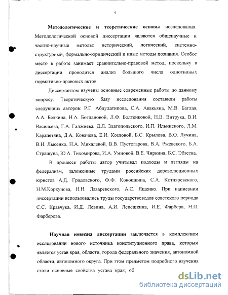 Степень разработанности темы. Современная научная литература по конституционному праву не обошла вниманием новый предмет исследования - устав края, области, автономного округа, автономной области, города федерального значения. В ряде работ по конституционному праву изучались уставы, их содержание, место, которое они занимают в структуре российского законодательства. Однако эти исследования, как правило, посвящались изучению какой-либо одной проблемы. В то же время комплексного анализа устава края, области, города федерального значения, автономной области, автономного округа в качестве нового источника российского конституционного права до сих пор не предпринималось. Но именно такой метод исследования вопроса позволяет изучить многие проблемы законодательства субъектов Российской Федерации, в том числе связанные с сохранением единого конституционного пространства Российской Федерации, с эффективностью уставного регулирования.