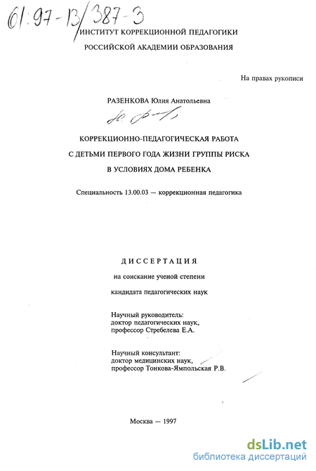 Предмет исследования — процесс комплексной коррекционно-педаго-гической работы с детьми первого года жизни группы риска в условиях специализированного дома ребенка.