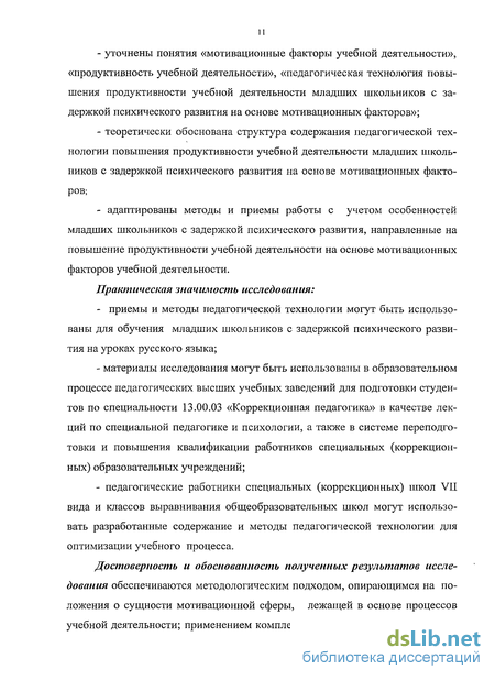дано научно-теоретическое обоснование педагогической технологии повышения продуктивности учебной деятельности младших школьников с задержкой психического развития на основе мотивационных факторов;