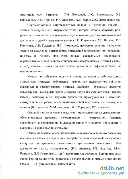 Соответствующий многоаспектный подход к изучению письма и чтения реализуется и в тифлопедагогике, которая, отводя ведущую роль развитию зрительного анализатора в осуществлении учебно-познавательной деятельности детей с нарушения зрения (Л.П. Григорьева, А.Г. Литвак, Г.В. Никулина, Л.И. Плаксина, Л.В. Фомичева), исследует влияние нарушения зрения на получение и переработку зрительной информации при овладении письмом и чтением. При этом, однако, специальные исследования, обращенные именно к периоду становления навыков письма и чтения у детей с нарушениями зрения, до настоящего времени в тифлопедагогики не предпринимались.