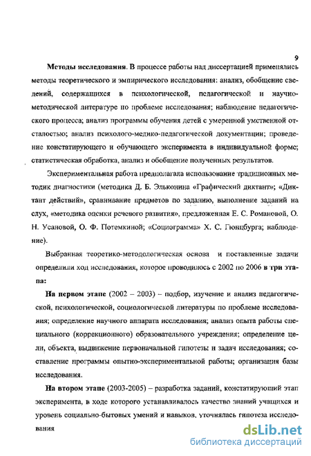 лиз, обобщение сведений, содержащихся в психологической, педагогической и научно-методической литературе по проблеме исследования, наблюдение педагогического процесса, анализ программы обучения детей с умеренной умственной отсталостью, анализ психолого-медико-педагогической документации, проведение констатирующего и обучающего эксперимента в индивидуальной форме, статистическая обработка, анализ и обобщение полученных результатов