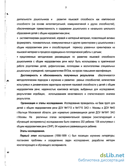 Второй этап (1999-2000 г.) был направлен на теоретическое обоснование методики экспериментального изучения языковой способности дошкольников, проведение констатирующего эксперимента, обобщение и систематизацию полученных данных, разработку приемов и методов развития языковой способности, апробацию их на детях с общим недоразвитием речи младшего дошкольного возраста.