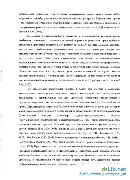 При выполнении космических полетов, а также при участии в модельных экспериментах, имитирующих отдельные стороны космической экспедиции, человек сталкивается с непривычными для него условиями. Изменения, происходящие в организме, затрагивают все системы органов, в том числе модифицируется и белковый состав крови. С помощью различных биохимических методов (например, радиоиммуннологического анализа, иммунодиффузии, электрофореза в ацетатцеллюлозном геле) были проанализированы изменения многих гормонов белковой природы (инсулина, соматотропина, ренина и других) [Ларина И.М. 2000; 2003; Григорьев А.И. с соавт., 1999], компонентов иммунной системы (иммуноглобулинов, факторов комплемента) [Гусева Е.В., Ташпулатов Р.Ю, 1979, 1980: Герцик Ю.Г., 2004], белков системы свертывания крови [Фомин, А.Н., 1981] и «острой» фазы [Ларина О.Н., 1992; 2006], ферментов [Маркин А.А., 2001], в т.ч. протеолитических [Тигранян с соавт., 1987]. Протеомные методы для анализа изменений белков в космических полетах и наземных экспериментах ранее не использовались.