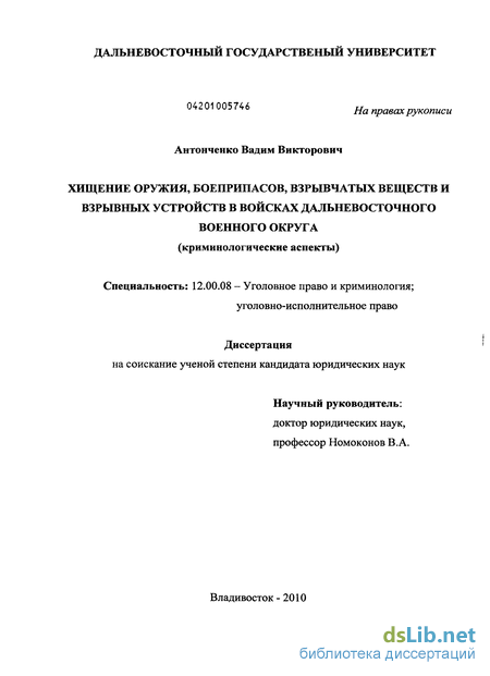 Научная новизна диссертационного исследования. Автор впервые предпринял попытку провести специальное криминологическое исследование преступлений, связанных с хищением предметов вооружения в войсках ДВО, с учетом региональной специфики. Впервые воедино собраны и оценены эмпирические данные, характеризующие состояние преступности, связанной с незаконным оборотом оружия в войсках ДВО, и дан среднесрочный прогноз состояния преступности в указанной сфере с учетом мероприятий по переходу Вооруженных сил на новый перспективный облик.
