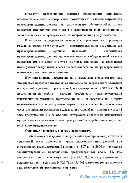 совершаемых в отношении работников милиции. Но посягательства на жизнь сотрудников правоохранительных органов не выделялись ими в самостоятельный предмет исследования. Кроме того, следует учитывать, что эти работы были написаны на основе статистических и эмпирических данных начала 90-х годов. Остается неизученной специфическая детерминация этих преступлений, что затрудняет разработку эффективных мер по их предупреждению. Рост исследуемых преступлений, усиление ряда негативных явлений в деятельности правоохранительных органов обуславливают необходимость всестороннего анализа криминологической характеристики посягательств на жизнь сотрудников правоохранительных органов и особенностей их предупреждения.