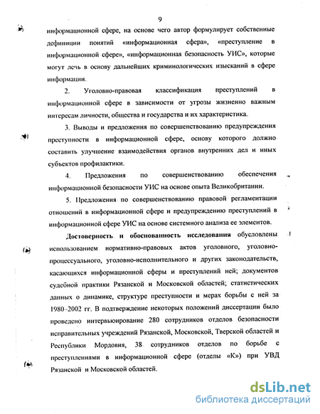 процессуального, уголовно-исполнительного и других законодательств, касающихся информационной сферы и преступлений ней; документов судебной практики Рязанской и Московской областей; статистических данных о динамике, структуре преступности и мерах борьбы с ней за 1980-2002 гг. В подтверждение некоторых положений диссертации было проведено интервьюирование 280 сотрудников отделов безопасности исправительных учреждений Рязанской, Московской, Тверской областей и Республики Мордовия, 38 сотрудников отделов по борьбе с преступлениями в информационной сфере (отделы «К») при УВД Рязанской и Московской областей.