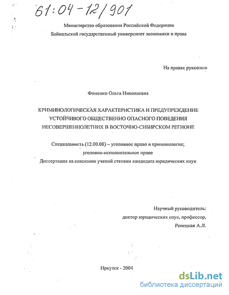 Цели исследования. Целью настоящего диссертационного исследования является изучение тенденций изменения криминологических характеристик устойчивого общественно опасного поведения несовершеннолетних ряда территорий Восточной Сибири; личности несовершеннолетнего с устойчивым общественно опасным поведением; теоретическое обоснование концепции независимого участия негосударственных субъектов в профилак-