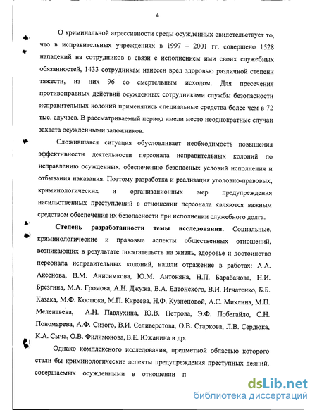 Степень разработанности темы исследования. Социальные, криминологические и правовые аспекты общественных отношений, возникающих в результате посягательств на жизнь, здоровье и достоинство персонала исправительных колоний, нашли отражение в работах: А.А. Аксенова, В.М. Анисимкова, Ю.М. Антоняна, Н.П. Барабанова, Н.И. Брезгина, М.А. Громова, А.Н. Джужа, В.А. Елеонского, В.И. Игнатенко, Б.Б. Казака, М.Ф. Костюка, М.П. Киреева, Н.Ф. Кузнецовой, А.С. Михлина, М.П. Мелентьева, А.Н. Павлухина, Ю.В. Петрова, Э.Ф. Побегайло, С.Н. Пономарева, А.Ф. Сизого, В.И. Селиверстова, О.В. Старкова, Л.В. Сердюка, К.А. Сыча, О.В. Филимонова, В.Е. Южанина и др.