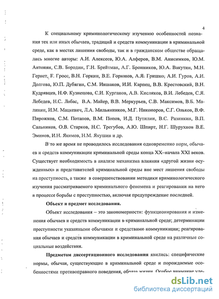 Предметом диссертационного исследования явились: специфические нормы, обычаи, существующие в криминальной среде и порождаемые особенностями противоправного поведения, образа жизни. Особое внимание уде лено обычаям криминальной среды организованных и профессиональных преступников, их взаимосвязям с нормами, обычаями и средствами коммуникации делинквентных групп несовершеннолетних и молодых людей; средства коммуникации в криминальной среде России на разных исторических этапах и за рубежом (США, Япония и др. государства), в том числе функционирующие как в местах, лишения свободы, так и вне таких мест.