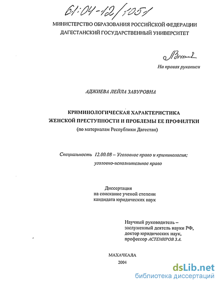 Предмет исследования: картина женской преступности в Республике Дагестан на фоне показателей по РФ её основные тенденции, причины и условия женской преступности в зависимости от сферы их проявления; «портрет женщины-преступницы», ее типологическая характеристика; практика и эффективность принимаемых мер правового, социально-экономического и организационного характера по борьбе с женской преступностью.