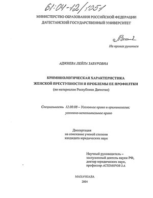 Апробация результатов исследования. Основные положения диссертации нашли отражение в выступлениях на различных научных форумах и конференциях, а также в опубликованных тезисах докладов и статьях. По материалам диссертации разработан и читается спецкурс в Хасавюртовском филиале ДГУ «Женская преступность и проблемы ее профилактики». Положения диссертации неоднократно обсуждались на кафедре уголовного права и криминологии юридического факультета ДГУ.