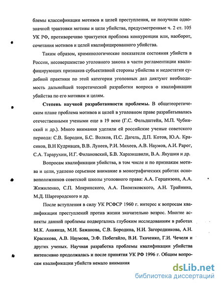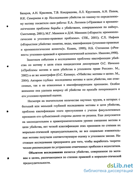 Базаров, А.Н. Красиков, Т.В. Кондрашова, Л.Л. Кругликов, А.Н. Попов, Н.К. Семернева и др. Исследованию убийства по какому-то определенному мотиву посвятили свои работы: Е.А. Логинов («Правовые и криминологические проблемы борьбы с убийствами, совершаемыми по найму». Сыктывкар, 2001); М.Г. Миненок и Д.М. Миненок («Корысть: криминологические и уголовно-правовые проблемы». СПб., 2001); С.Х. Нафиев («Корыстное убийство: понятие, виды, квалификация (уголовно-правовые и криминологические аспекты)». Казань, 1999); И.Б. Степанова («Ревность: уголовно-правовой и криминологический аспекты». Иваново, 1998).