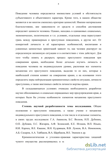 Проблемам криминологической характеристики краж, выявлению причин и условий, способствующих совершению этого преступления, изучению лиц, совершающих кражи, а также разработке мер по их предупреждению, посвящено много фундаментальных трудов. Некоторые из них частично затрагивают отдельные элементы механизма преступного поведения, но ни одна из этих работ не была специально посвящена изучению механизма преступного поведения при совершении кражи, выявлению криминологически значимых элементов механизма преступного поведения при совершении кражи и разработке на этой основе мер по предупреждению изучаемых преступлений.