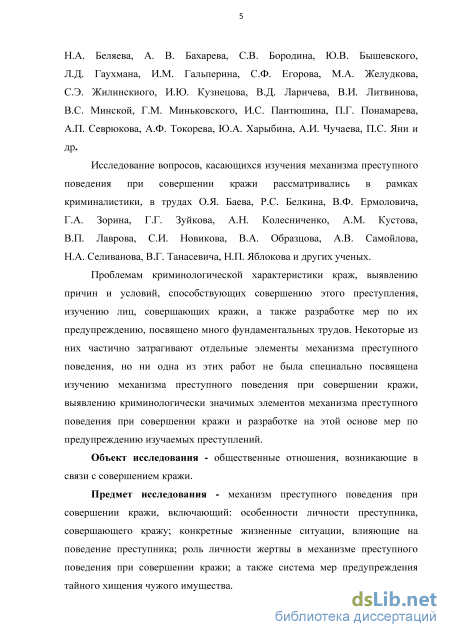Предмет исследования - механизм преступного поведения при совершении кражи, включающий: особенности личности преступника, совершающего кражу; конкретные жизненные ситуации, влияющие на поведение преступника; роль личности жертвы в механизме преступного