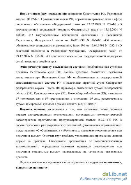 Методологическая основа исследования. В ходе диссертационного исследования использовались общенаучные и частнонаучные методы. Общенаучные методы: диалектический и исторический методы – при изучении процесса разработки и введения в действие нормы о мошенничестве при получении выплат; системный метод – при определении объекта данного преступления; статистический метод - при исследовании материалов уголовных дел о мошенничестве при получении выплат, судебной статистики; кроме того, использовались такие общенаучные методы как сравнительный анализ, синтез и др. Частнонаучные методы: сравнительно-правовой – при исследовании иных норм о мошенничестве в российском и зарубежном законодательстве об аналогичных преступлениях; формально-юридический метод – при исследовании уголовно-правовой нормы о мошенничестве при получении выплат, определении способов его совершения.