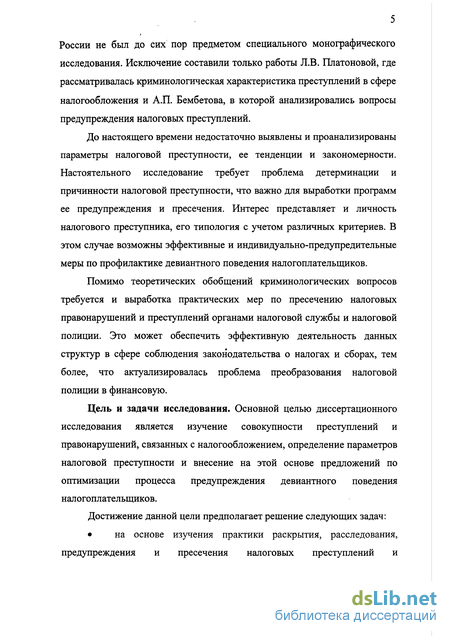 Цель и задачи исследования. Основной целью диссертационного исследования является изучение совокупности преступлений и правонарушений, связанных с налогообложением, определение параметров налоговой преступности и внесение на этой основе предложений по оптимизации процесса предупреждения девиантного поведения налогоплательщиков.