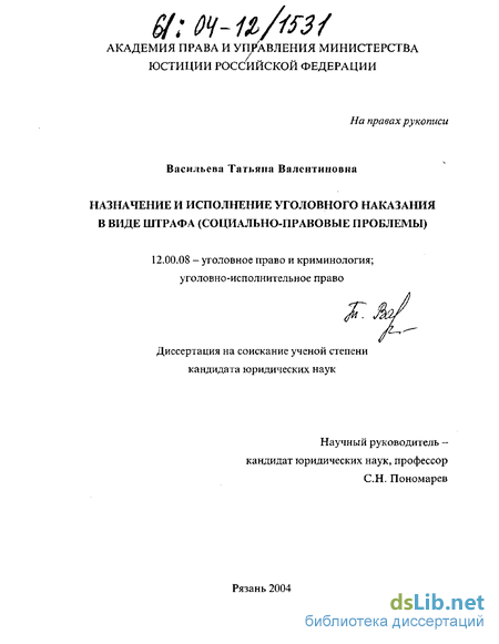Апробация и внедрение результатов исследования. Основные выводы, предложения и рекомендации диссертационного исследования прошли апробацию в процессе выступления на двух научно-практических конференциях "Экономико-психологические и правовые вопросы гуманитарного образования" (Калуга, апрель 2002 г.) и "Качество жизни региона" (Калуга, апрель 2003 г.). По теме диссертационного исследования автором подготовлены и опубликованы пять научных статей, учебное пособие "Штраф в российском уголовном законодательстве".