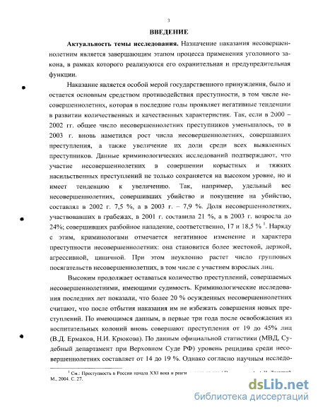 Наказание является особой мерой государственного принуждения, было и остается основным средством противодействия преступности, в том числе несовершеннолетних, которая в последние годы проявляет негативные тенденции в развитии количественных и качественных характеристик. Так, если в 2000 2002 гг. общее число несовершеннолетних преступников уменьшалось, то в 2003 г. вновь наметился рост числа несовершеннолетних, совершавших преступления, а также увеличение их доли среди всех выявленных преступников. Данные криминологических исследований подтверждают, что участие несовершеннолетних в совершении корыстных и тяжких насильственных преступлений не только сохраняется на высоком уровне, но и имеет тенденцию к увеличению. Так, например, удельный вес несовершеннолетних, совершивших убийство и покушение на убийство, составлял в 2002 г. 7,5 %, а в 2003 г. - 7,9 %. Доля несовершеннолетних, участвовавших в грабежах, в 2001 г. составила 21 %, а в 2003 г. возросла до 24%; совершивших разбойное нападение, соответственно, 17 и 18,5 % . Наряду с этим, криминологами отмечается негативное изменение и характера преступности несовершеннолетних: она становится более жестокой, дерзкой, агрессивной, циничной. При этом неуклонно растет число групповых посягательств несовершеннолетних, в том числе с участием взрослых лиц.