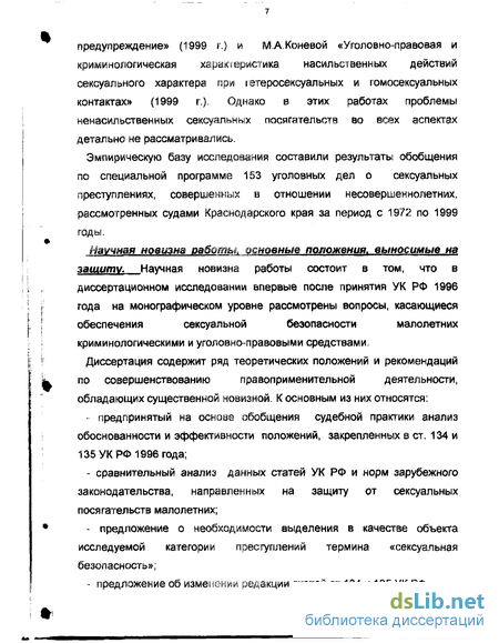 предупреждение» (1999 г.) и М.А.Коневой «Уголовно-правовая и криминологическая характеристика насильственных действий сексуального характера при гетеросексуальных и гомосексуальных контактах» (1999 г.). Однако в этих работах проблемы ненасильственных сексуальных посягательств во всех аспектах детально не рассматривалась.