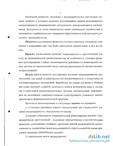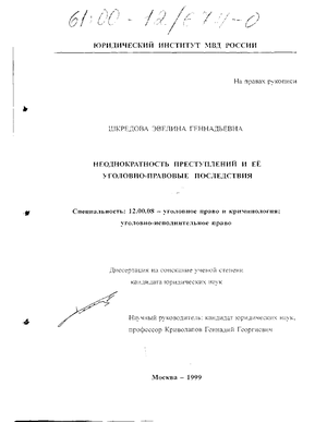Целью работы является всестороннее изучение неоднократности преступлений, как одной из разновидностей множественности и осмысление её уголовно-правовых последствий. Выработка, на основе изучения и обобщения существующей судебной практики и оценки результатов опроса экспертов и работников правоохранительных органов, рекомендаций, направленных на дальнейшее совершенствование существующего уголовного законодательства и правоприменительной практики.