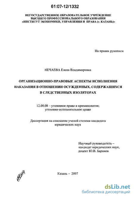 ганизационно-правовых аспектов исполнения наказания в виде лишения свободы в отношении осужденных, содержащих в следственных изоляторах.