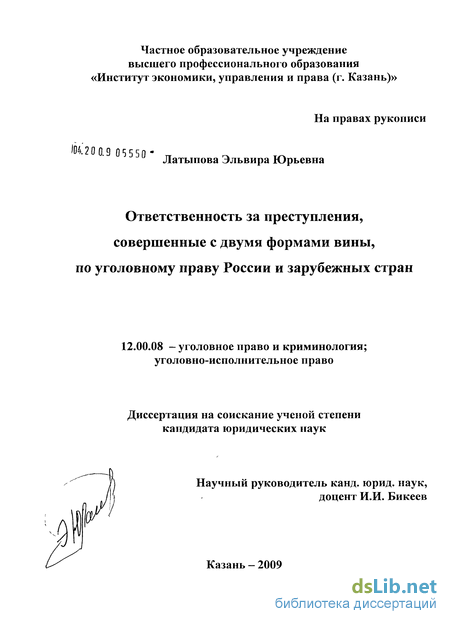 Куликов Л.В. Двойная форма вины: понятие, виды, конструкция составов, квалификация: Дисс... канд. юрид. наук. - Свердловск, 1990.
