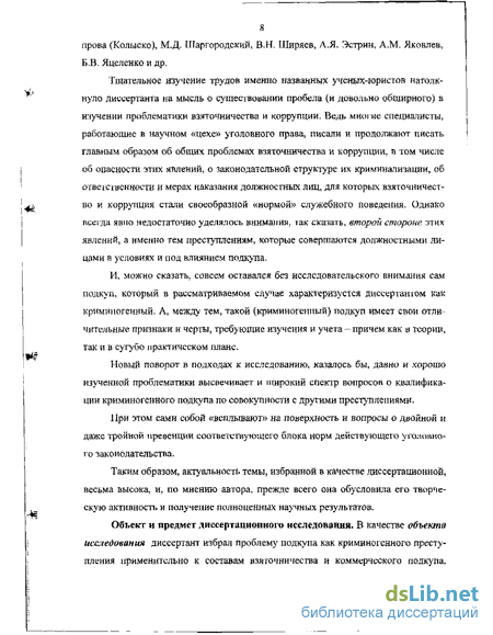 Тщательное изучение трудов именно названных ученых-юристов натолкнуло диссертанта на мысль о существовании пробела (и довольно обширного) в изучении проблематики взяточничества и коррупции. Ведь многие специалисты, работающие в научном «цехе» уголовного права, писали и продолжают писать главным образом об общих проблемах взяточничества и коррупции, в том числе об опасности этих явлений, о законодательной структуре их криминализации, об ответственности и мерах наказания должностных лиц, для которых взяточничество и коррупция стали своеобразной «нормой» служебного поведения. Однако всегда явно недостаточно уделялось внимания, так сказать, второй стороне этих явлений, а именно тем преступлениям, которые совершаются должностными лицами в условиях и под влиянием подкупа.