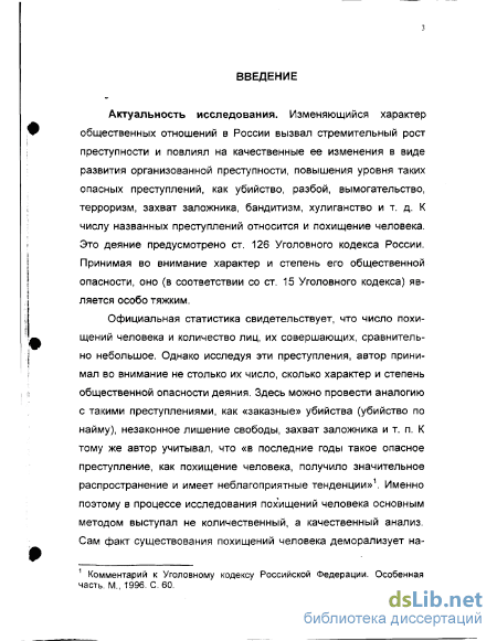 Актуальность исследования. Изменяющийся характер общественных отношений в России вызвал стремительный рост преступности и повлиял на качественные ее изменения в виде развития организованной преступности, повышения уровня таких опасных преступлений, как убийство, разбой, вымогательство, терроризм, захват заложника, бандитизм, хулиганство и т. д. К числу названных преступлений относится и похищение человека. Это деяние предусмотрено ст. 126 Уголовного кодекса России. Принимая во внимание характер и степень его общественной опасности, оно (в соответствии со ст. 15 Уголовного кодекса) является особо тяжким.