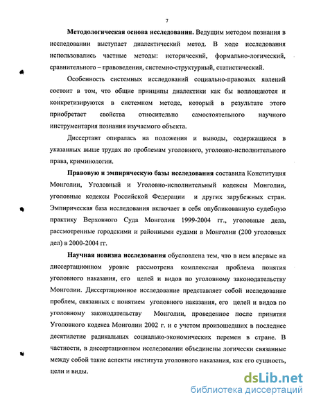 Цели и задачи исследования. Целью диссертационного исследования является научное обоснование комплексного подхода к решению проблем, связанных с выявлением понятия уголовного наказания Монголии, его целей и видов в современный период и, соответственно, выработка предложений по более эффективному использованию института уголовного наказания в борьбе с преступностью. Цель исследования предопределила постановку и решение следующих задач: