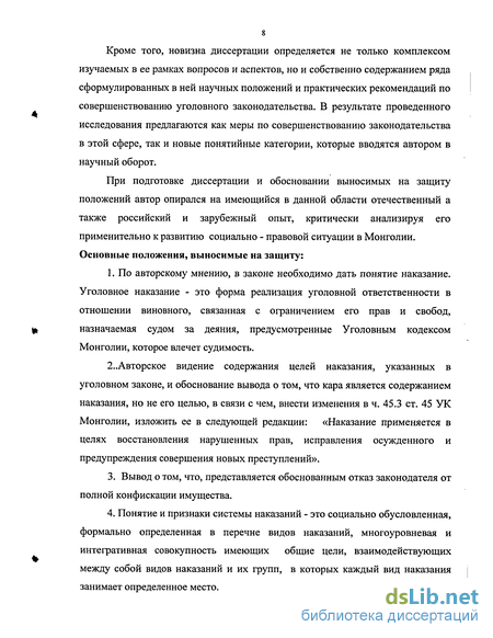 Следует иметь в виду, что вопросы понятия уголовного наказания, его целей и видов по уголовному законодательству Монголии в данной логической последовательности и целостности не рассматривались и ранее. Недостаточно освещены в данном контексте историко-правовые аспекты развития института уголовного наказания. В настоящей диссертации сделана попытка определенным образом восполнить этот и указанные выше пробелы.
