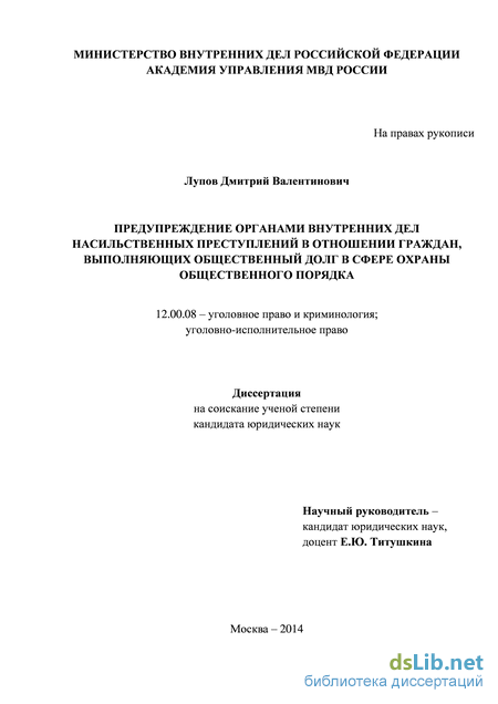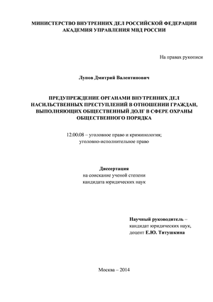 Совершенствование правовых основ деятельности органов внутренних дел по предупреждению насильственных преступлений в отношении граждан, выполняющих общественный долг в сфере охраны общественного порядка