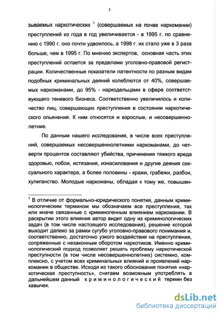 Данные проблемы получили конкретизацию в работах Э.Г.Гасанова, А.Я.Гришко, И.К.Горшенева, С.Я.Киркина, Д.В.Колесова, Г.М.Меретунова, Н.Г.Найденова, А.И.Нигматулина, В.И.Омигова, Н.И.Полозова, П.Н.Сбирунова, С.В.Турцевича, М.Л.Хоменкера и др. В их исследованиях определенное место занимают и вопросы, посвященные криминальным последствиям наркомании в молодежной среде. Кроме того, большинство трудов, касающихся криминологического анализа преступности несовершеннолетних, содержат некоторую характеристику той ее части, которая связана с наркоманией. Это вполне объяснимо, поскольку преступность подростков все больше становится именно наркотической. Во всяком случае, образ жизни юного правонарушителя так или иначе всегда сопряжен с употреблением одурманивающих веществ, на первом месте из которых стоят наркотики.
