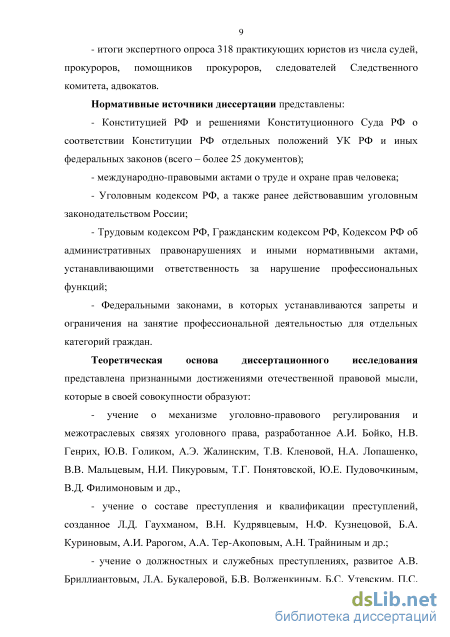 исследования составили положения и принципы диалектики, выдвигающей к процессу познания требования объективности, всесторонности, конкретности, историзма, связи теории с практикой. Работа основана также на использовании преимуществ системного метода. Его постулаты и инструментальные понятия («модель», «система», «элемент», «связь», «оптимальность» и др.) позволили не только рассмотреть механизм уголовно-правового воздействия на лиц, занимающихся профессиональной деятельностью, в качестве целостного комплекса взаимодействующих и взаимосвязанных правовых предписаний и правоотношений, но и органично включить этот уголовно-правовой механизм в общую систему правового регулирования профессиональной деятельности.