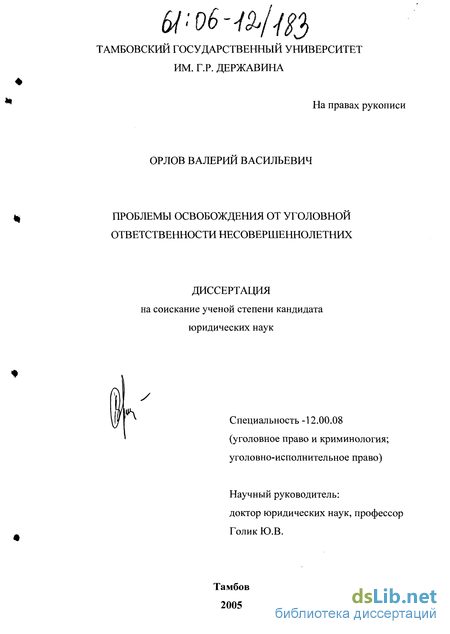 Вместе с тем немногие из работ касались непосредственно освобождения от уголовной ответственности несовершеннолетних. Так среди исследований необходимо назвать кандидатские диссертации Н.В. Угольниковой «Прекращение уголовного дела в отношении несовершеннолетних с применением мер воспитательного воздействия» (Москва, 2000), В.Н. Ткачев «Освобождение несовершеннолетних от уголовной ответственности и восстановительное правосудие» (Ростов на Дону, 2002). В первой работе рассматривались процессуальные проблемы освобождения от уголовной ответственности касающиеся сущности прекращения уголовного дела в отношении несовершеннолетних с применением принудительных мер воспитательного воздействия, а во второй определена природа института освобождения несовершеннолетних от уголовной ответственности как наиболее эффективного уголовно-правового приема обеспечения восстановительного правосудия.