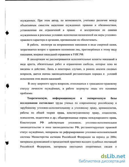 Теоретическую, информационную и эмпирическую базы исследования составляют труды ученых по современному российскому и зарубежному уголовно-исполнительному и уголовному праву, криминологии, работы по общей теории права, конституционному праву, социологии, психологии, педагогики и др.; общепризнанные нормы международного права, Конституция РФ действующее уголовное, уголовно-исполнительное законодательство и иное законодательство РФ, регламентирующее правовой статус осуждённых, материалы по реформированию уголовно-исполнительной системы Министерства юстиции Российской Федерации на период до 200b; материалы руководящей и прецедентной практики высших судебных инстанций Российской Федерации, материалы ежегодных оперативных сводок о