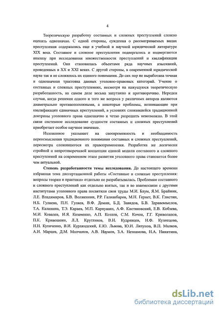 Степень разработанности темы исследования. До настоящего времени избранная тема диссертационной работы «Составные и сложные преступления: вопросы теории и практики» отдельно не разрабатывалась. Проблемам составного и сложного преступлений как отдельно взятых, так и во взаимосвязи с другими институтами уголовного права посвятили свои труды М.И. Блум, Я.М. Брайнин, Л.Е. Владимиров, Б.В. Волженкин, Р.Р. Галиакбаров, М.М. Гернет, В.К. Глистин, Н.Б. Гулиева, П. Гуляев, В.Ф. Демин, Б.Д. Завидов, Б.В. Здравомыслов, Т.А. Калинина, Т.Э. Караев, М.П. Карпушин, А.Ф. Кистяковский, Е.В. Кобзева, М.И. Ковалев, И.Я. Козаченко, А.П. Козлов, С.М. Кочои, Г.Г. Криволапов, П.К. Кривошеин, Л.Л. Кругликов, В.Н. Кудрявцев, Н.Ф. Кузнецова, Н.Н. Куличенко, В.И. Курляндский, Е.Ю. Львова, Ю.И. Ляпунов, В.П. Малков, А.И. Марцев, Д.М. Молчанов, А.В. Наумов, З.А. Незнамова, Н.А. Никитина, В.А. Никонов, Г.П. Новоселов, А.М. Ораздурдыев, А.И. Рарог, Н.Н. Рогова, А.А. Пионтковский, В.В. Питецкий, С.Н. Романюк, Н.М. Свидлов, Н.К. Семернева, А.И. Стрельников, Н.С. Таганцев, Х.А. Тимершин, Г.Т. Ткешелиадзе, А.Н. Трайнин, А.М. Трухин, Т.Г. Черненко, Ю.Н. Юшков, А.М. Яковлев, П.С. Яни и ряд других ученых.