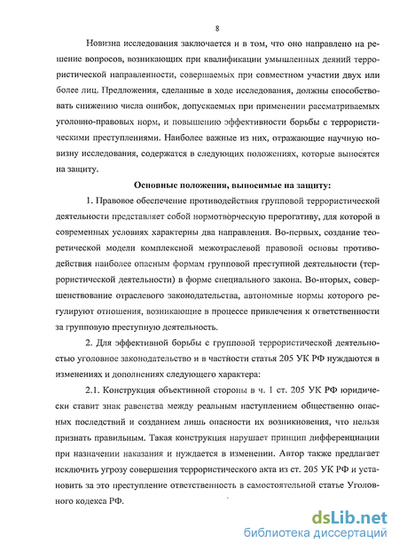 8 Новизна исследования заключается и в том, что оно направлено на решение вопросов, возникающих при квалификации умышленных деяний террористической направленности, совершаемых при совместном участии двух или более лиц. Предложения, сделанные в ходе исследования, должны способствовать снижению числа ошибок, допускаемых при применении рассматриваемых уголовно-правовых норм, и повышению эффективности борьбы с террористическими преступлениями. Наиболее важные из них, отражающие научную новизну исследования, содержатся в следующих положениях, которые выносятся на защиту.