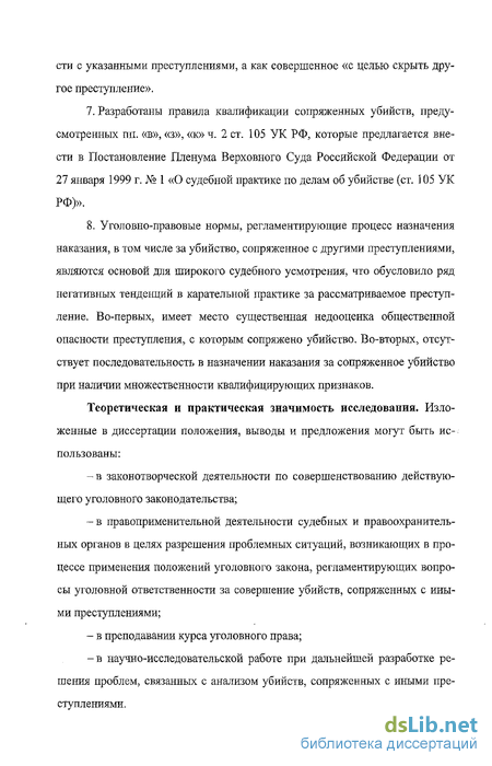 Научная новизна исследования. Опираясь на результаты исследования, основываясь на анализе уголовного законодательства и практики его применения, существующих точек зрения и на собственном видении вопроса, автор предпринял попытку впервые провести комплексное исследование проблемы убийства, сопряженного с иными преступлениями.