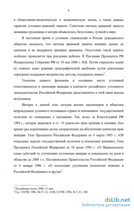 Интерес к данной теме сегодня вполне закономерен и объясним возрождением духовного потенциала страны и изменением государственной политики по отношению к женщинам. Так, вслед за Конституцией РФ 1993 г., которая закрепила в ст. 19 равенство прав мужчин и женщин, был принят ряд нормативных актов, направленных на обеспечение равенства прав женщин: Указ Президента Российской Федерации от 4 марта 1993 г. «Об очередных задачах государственной политики в отношении женщин»; Указ Президента Российской Федерации от 18 июня 1996 г. «О Национальном плане действий по улучшению положения женщин и повышению их роли в обществе до 2000 г.»; Постановление Правительства Российской Федерации от 8 января 1996 г. «О концепции улучшения положения женщин в Российской Федерации» и другие2.